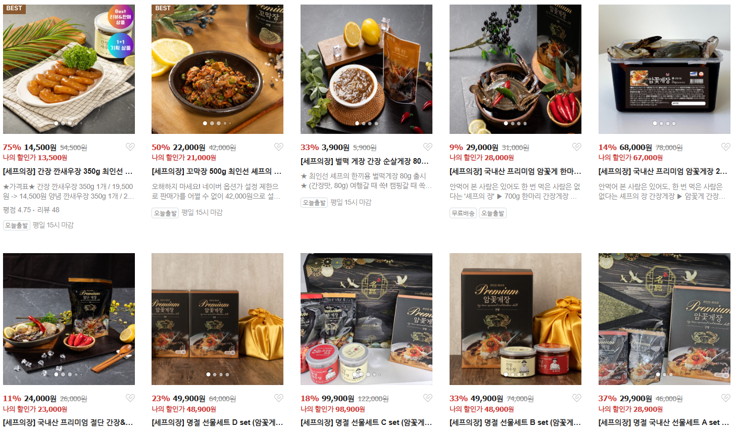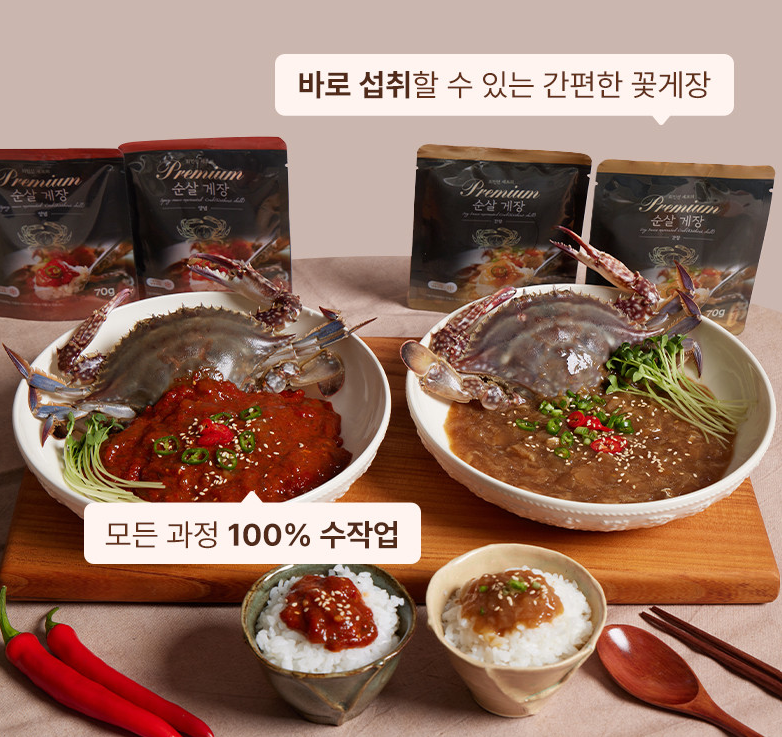 사진과 같이 여러 가지 상품을 판매중인데요. 프리미엄 라인의 경우 얼핏 보았을 때 같은 상품으로 오해할 소지가 있기 때문에 꼭 프리미엄 순살 게장이 맞는지 확인하고 구매할 필요가 있습니다.