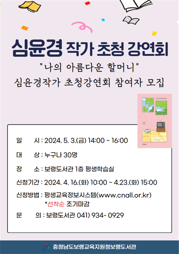 5월 가정의 달을 맞아 심윤경 작가 초청 강연회를 진행할 예정이라고 합니다.