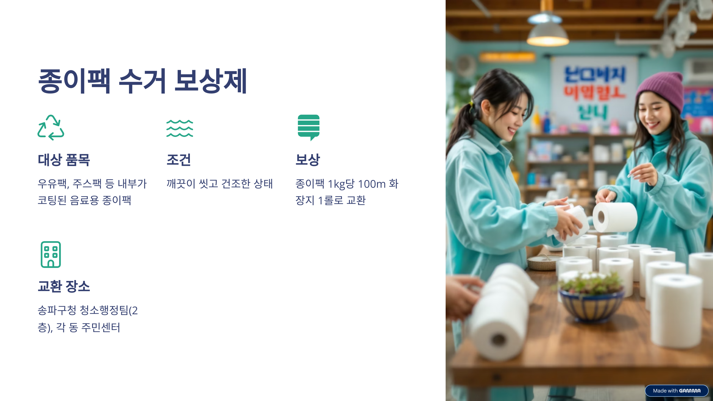 송파구는 자원 순환과 재활용 활성화를 위해 종이팩 1kg당 100m 화장지 1롤로 교환해주는 보상제를 운영 중이에요.