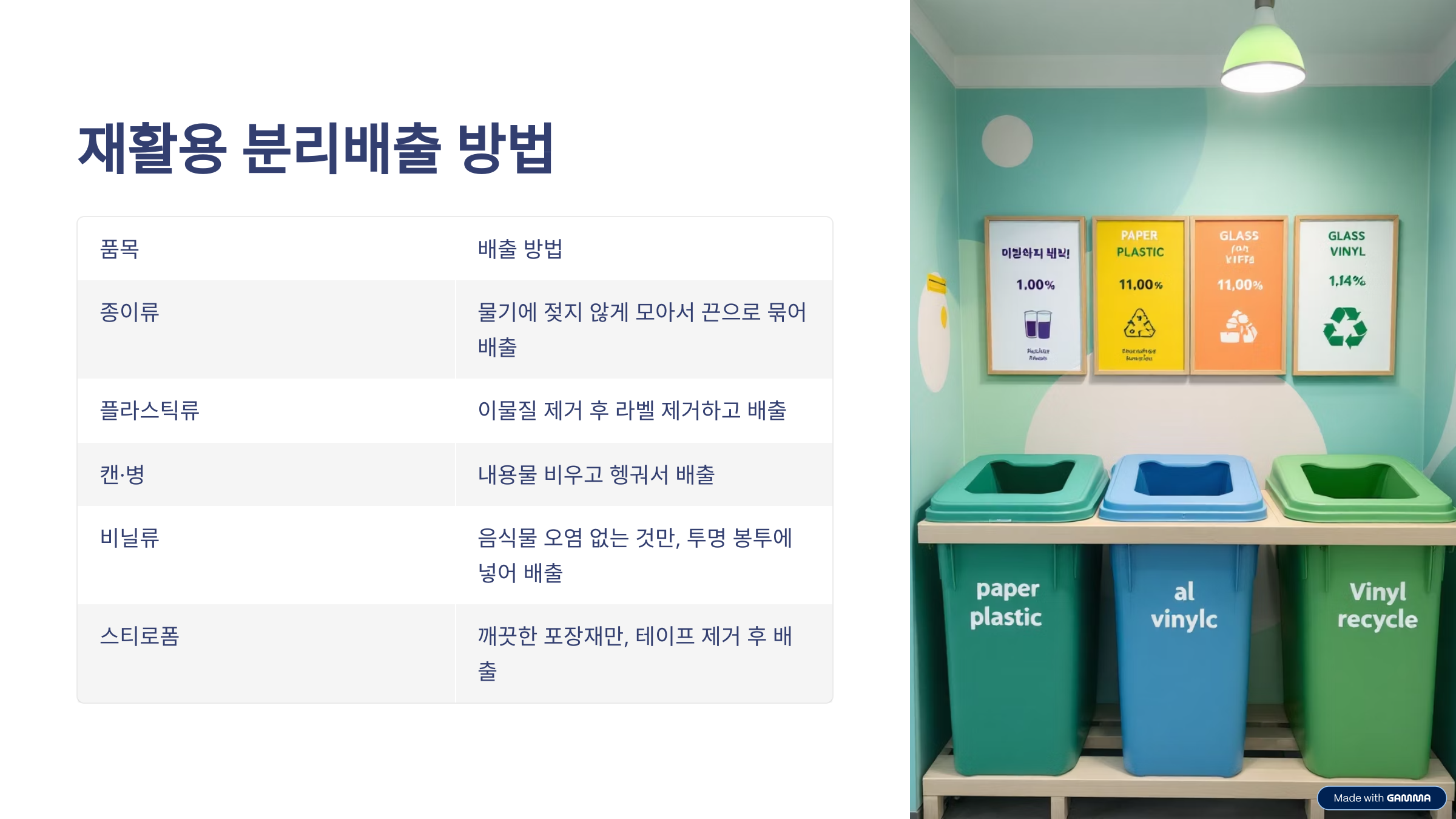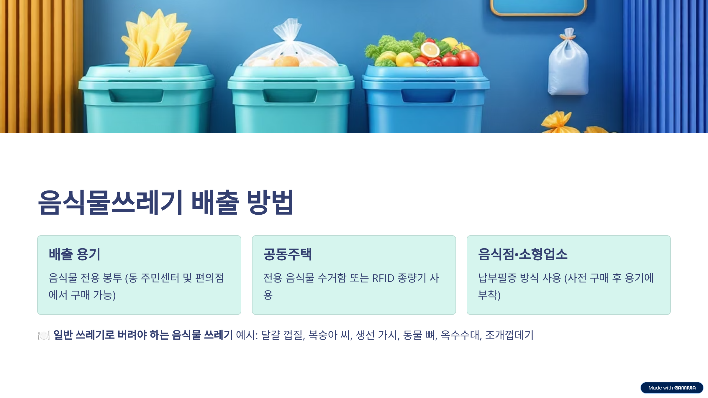 - 혼합 배출 금지: 음식물/재활용/일반쓰레기는 반드시 분리!