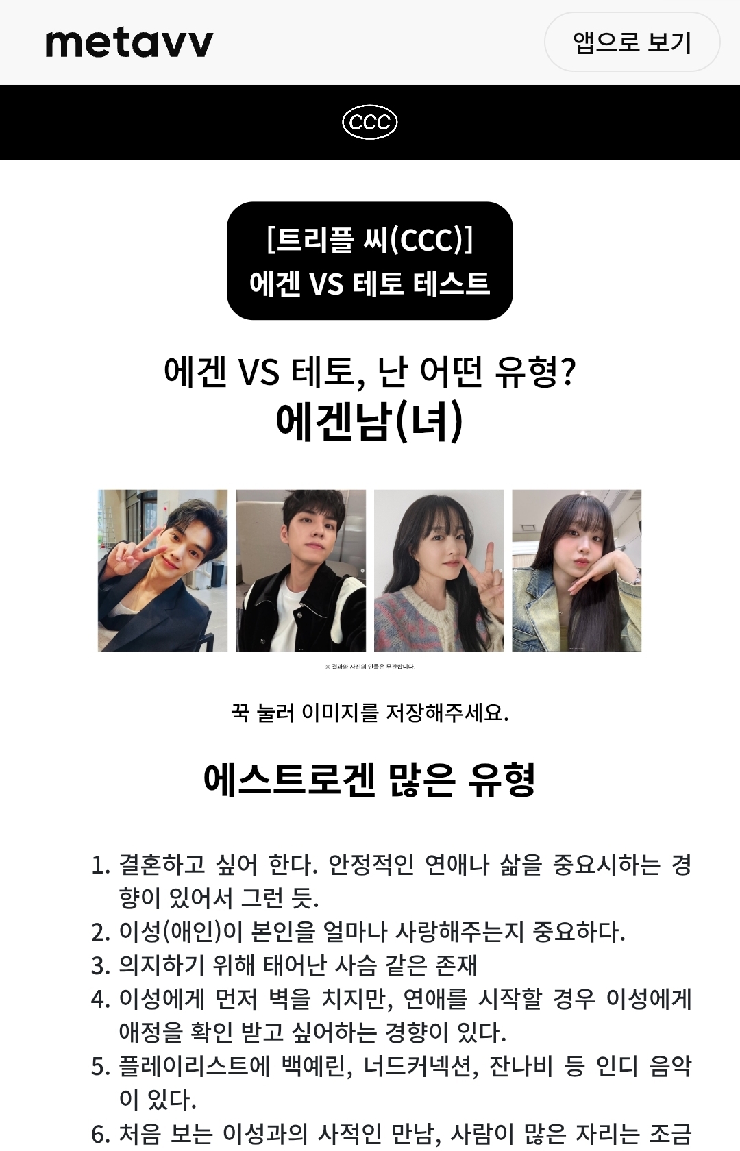 - 메타브(Metav): 웹에서 바로 가능, 유형별 특징 및 궁합까지 제공