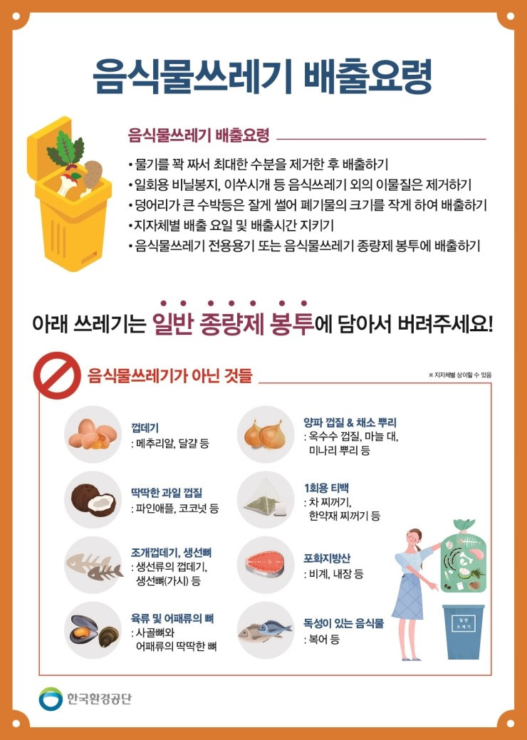 - 구분 주의: 조개껍데기, 뼈, 씨앗류, 티백 등은 일반쓰레기로 분류
