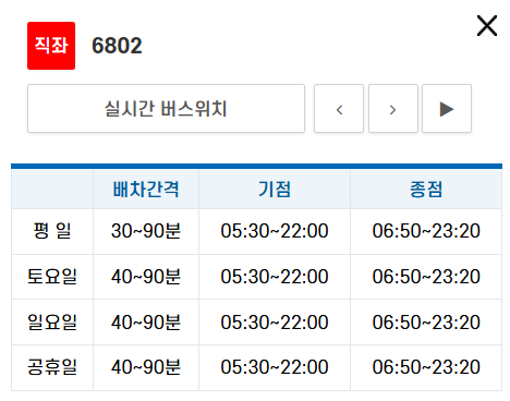 6802버스는 좌석버스이기 때문에 앞 정류장에서 만석이 될 경우, 탑승할 수 없는데요. 그렇기 때문에 실시간 좌석 수를 확인하는 것이 중요합니다. 또한 성남(야탑/판교)에서 고덕/송탄으로 내려갈 경우 기존 차량이 회차하는 방식이기 때문에 성남에서의 출발시간 예측이 힘든만큼 실시간 버스 위치를 확인하는 것 또한 중요합니다.