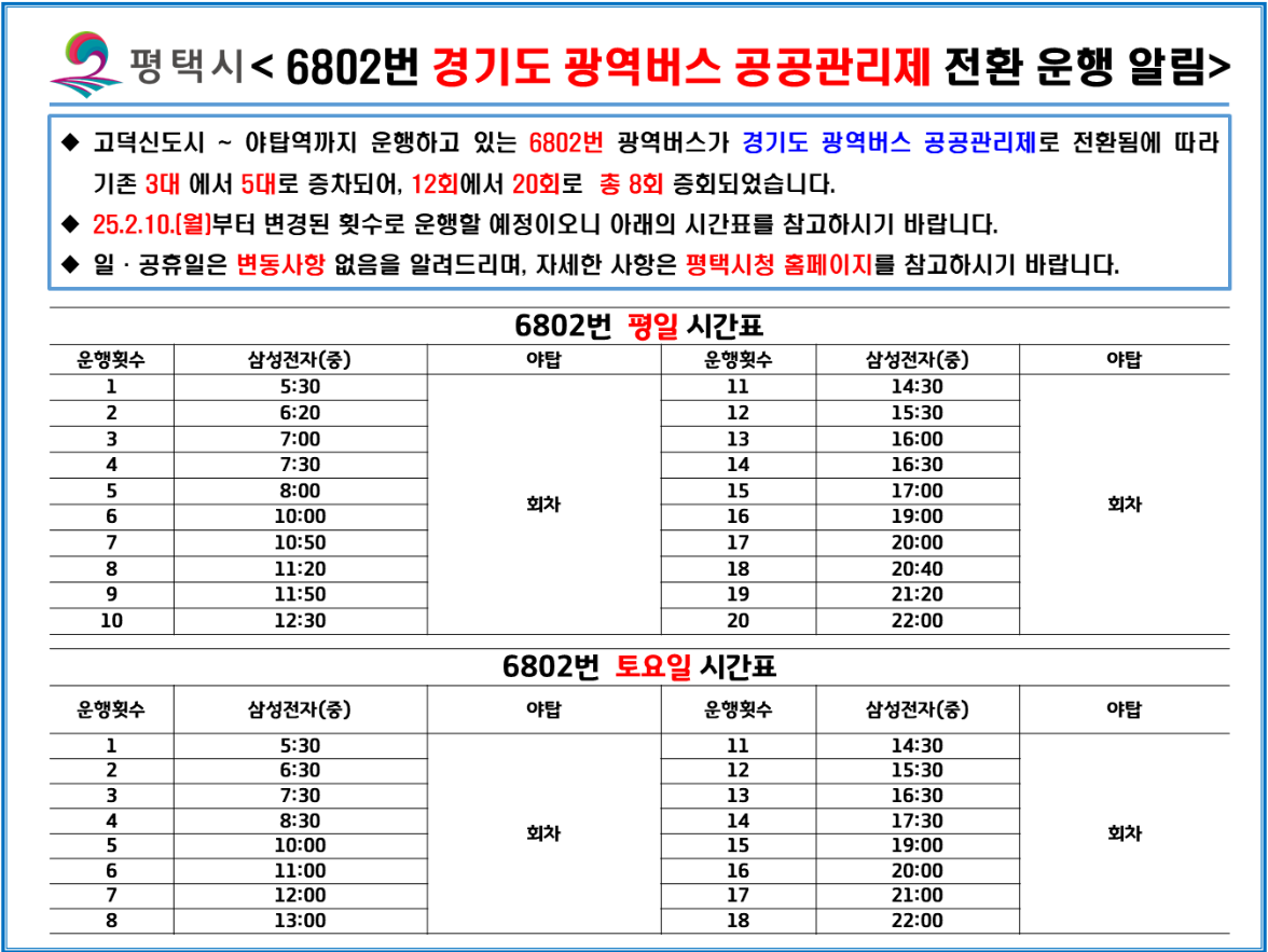 고덕에서 성남(야탑/판교)까지 운행되는 6802번 버스가 경기도 광역버스 공공관리제로 전환이 되면서 2025년 2얼 10일부터 기존의 3대에서 5대로 운행하는 차량의 대수가 증가됩니다. 운행 차량 대수의 증가에 따라 12회에서 20회로 총 8회가 증회된다고 하니 미리 바뀐 시간표에 대해 알아두시는 것이 좋겠습니다.
