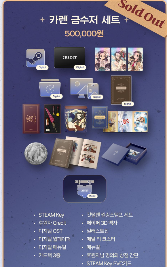 금수저, 수호성 세트는 각 500,000 원, 1,000,000 원이라는 높은 가격에도 불구하고 한정된 수량이 소진되었기 때문에 프린세스 메이커의 팬이라면 남은 펀딩 상품들을 신중히 살피신 후 빠르게 결정하는 것이 좋지 않을까 싶습니다.