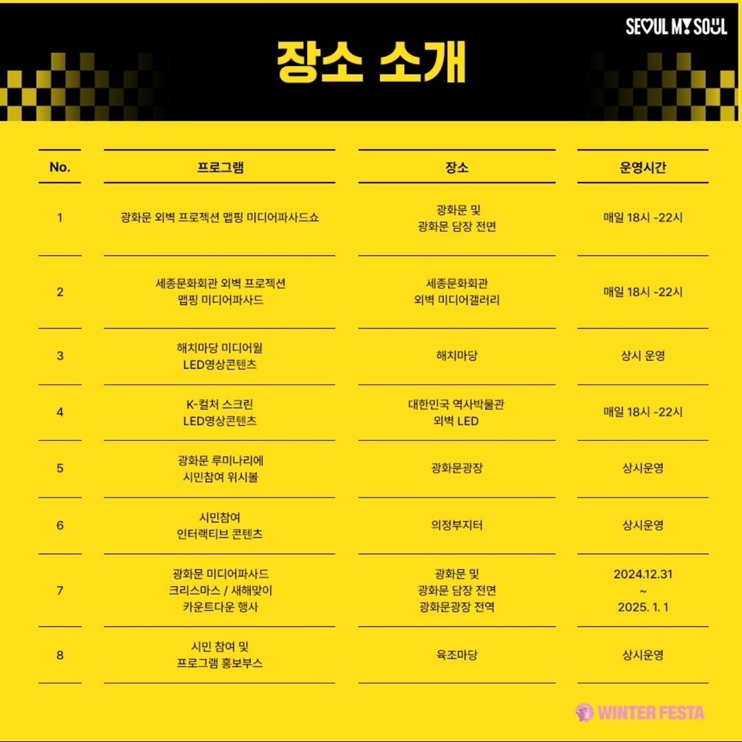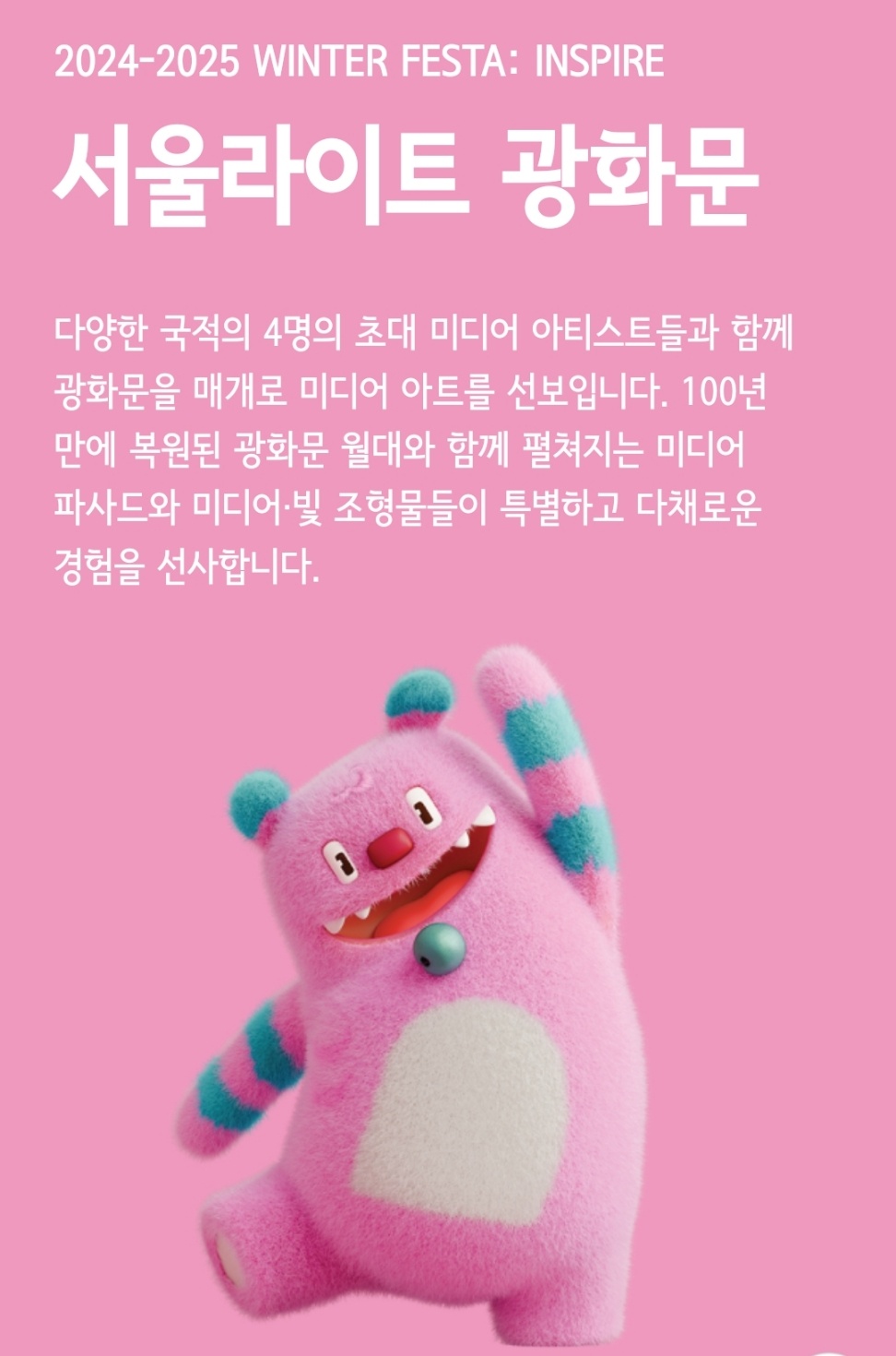 이렇게 13일 토요일부터 시작하는 서울 윈터페스타의 그 첫번째, 서울라이트 광화문 행사에 대해 알아보았습니다. 약 한달가까이 진행되는 행사이니만큼 시간나실때 방문하여 행복한 추억 만드시길바랍니다.